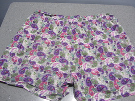 Брюки – из полотна с набивным тематическим рисунком, длинные, с эластичной тесьмой по талии и карманами в боковых швах, входы в которые окантованы основным материалом.